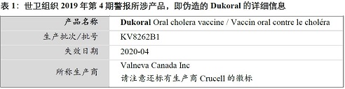 下页展示了此期警报所涉产品,即伪造的Dukoral的照片,并为医疗卫生专业人员和患者提供了建议。