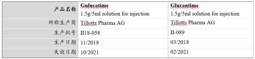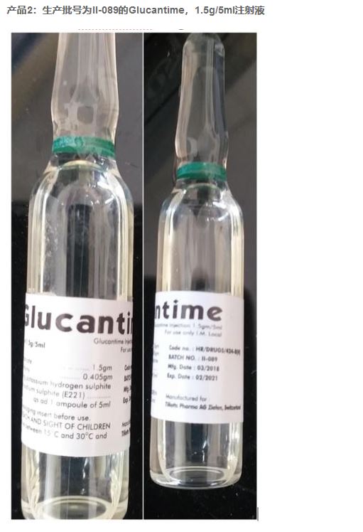 上述两种产品(Gulucatime和Glucantime)的包装或标签显示“为Tillotts Pharma AG制造”。但Tillotts Pharma AG公司已向世卫组织确认,他们既不生产或分包生产,也不在全球任何地方分销这些产品。