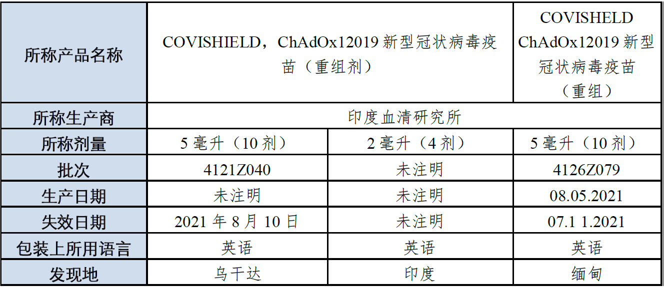 据世卫组织医疗产品警报,世卫组织非洲区域和世卫组织东南亚区域发现伪造的 COVISHIELD(ChAdOx1 2019 新型冠状病毒疫苗(重组剂))。世卫组织于2021 年7 月和8 月收到了关于这些伪造产品的报告。印度血清研究所(COVISHIELD 的真正生产商)已确认 本警报中所列产品为伪造。乌干达、印度和缅甸患者报称发现了这些伪造产品。